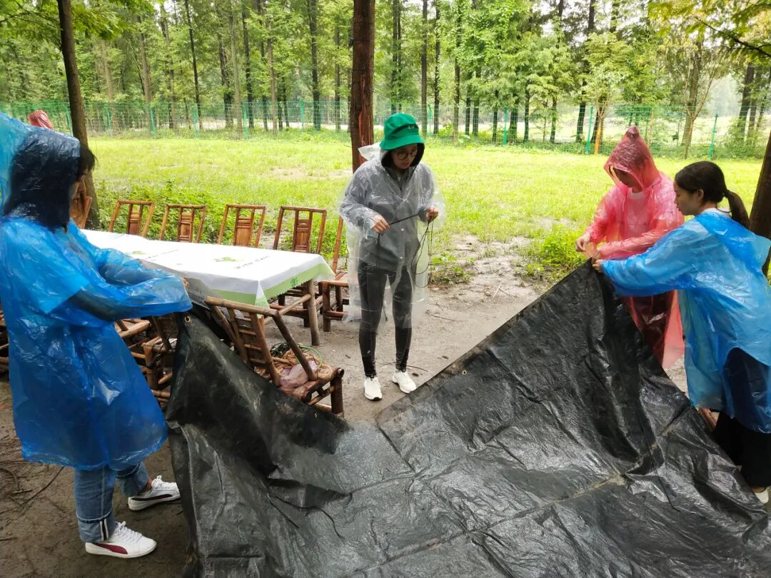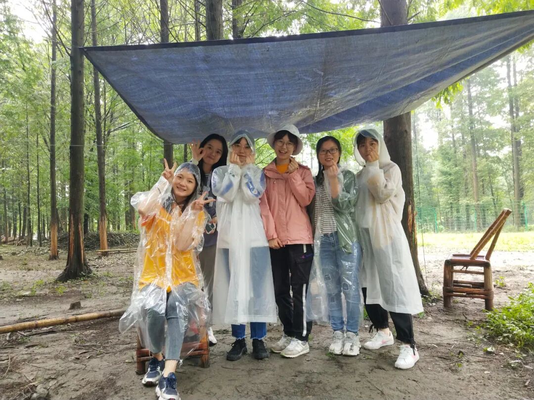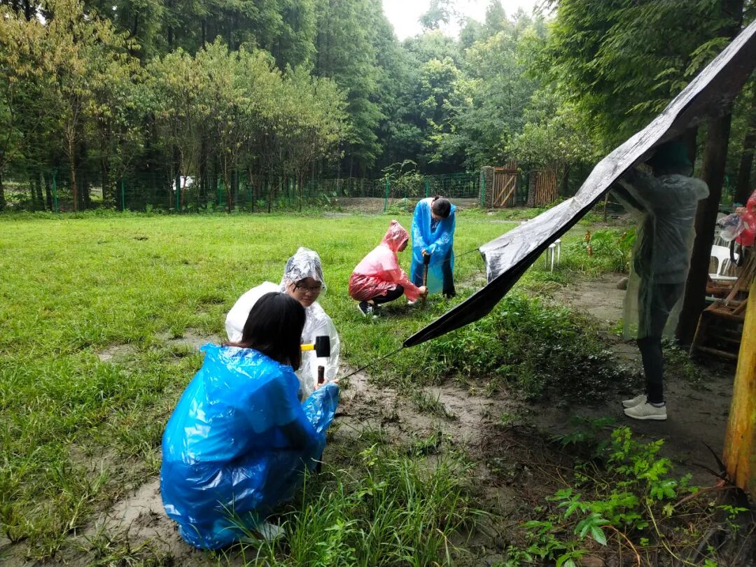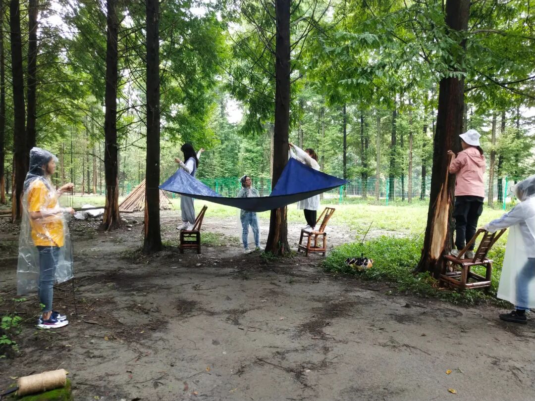 搭建庇护所。利用所学的绳结技能,搭建户外庇护所,从探讨到雨中搭建,在体验实践中发现问题,并解决问题。