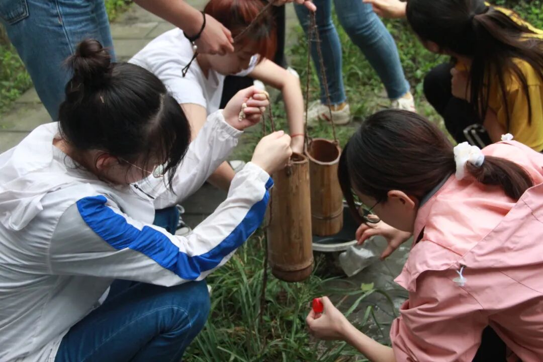 手工制作。老师们就地选材,利用工具和绳结技能,进行各种手工制作,秋千、木梯、水桶、相框……
